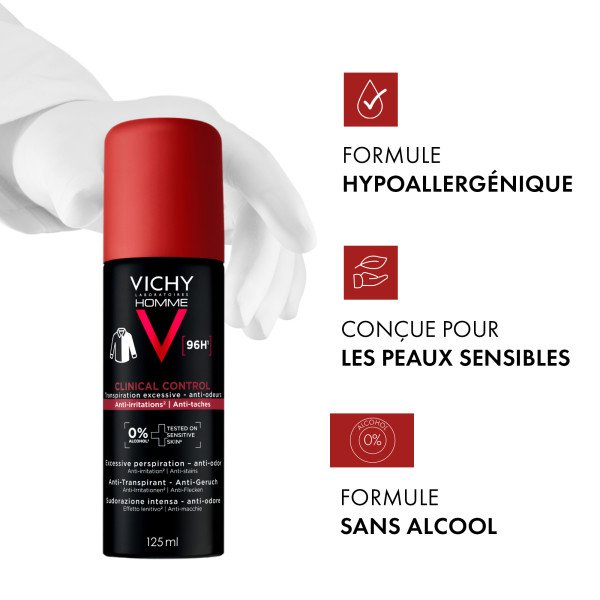 • Utilisez le Déodorant Aérosol CLINICAL CONTROL 96H quotidiennement, jour et nuit, en vaporisant à 15 cm des aisselles.