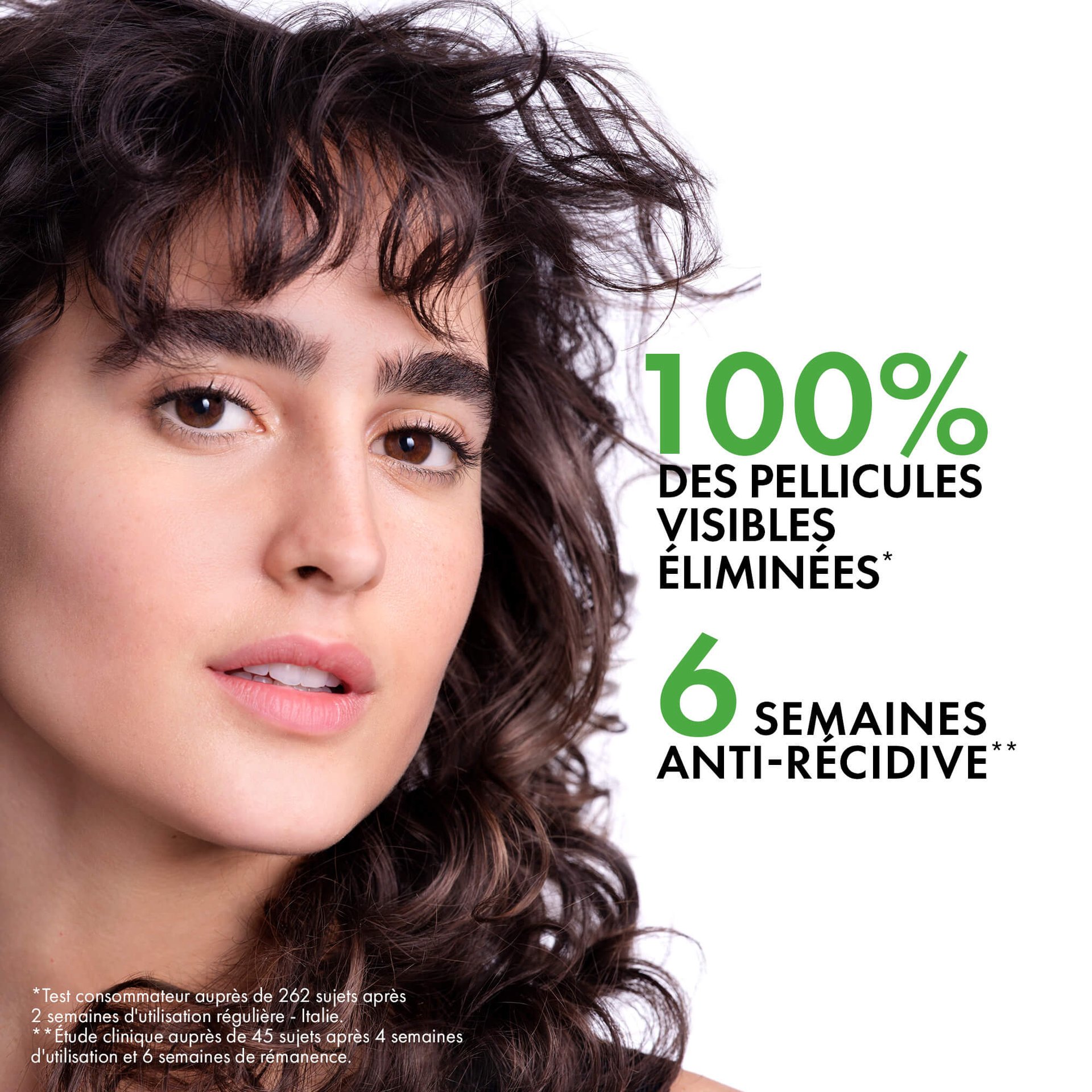 * Test consommateur sur 262 sujets après deux semaines d’utilisation régulière – Italie. **Étude clinique sur 32 sujets après 4 semaines d’utilisation et 6 semaines de rémanence. ***Étude clinique avec suivi des principaux micro-organismes impliqués dans les pellicules, 56 sujets avec 3 applications par semaine pendant 4 semaines.