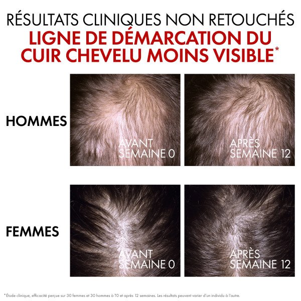 * Cheveux existants. Étude clinique sur 40 femmes et 37 hommes à raison de 5 applications par semaine durant 12 semaines.