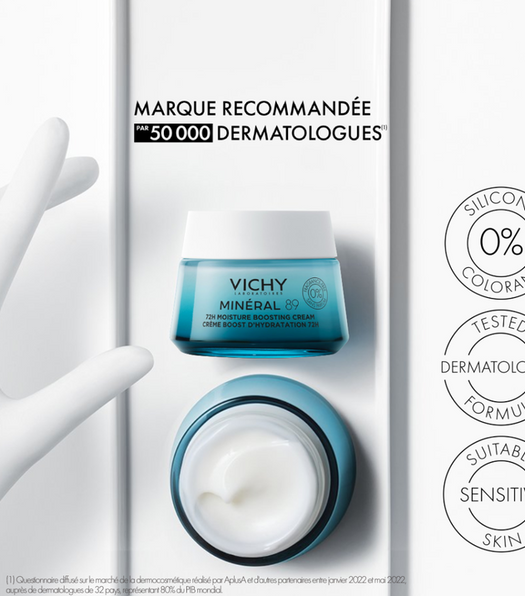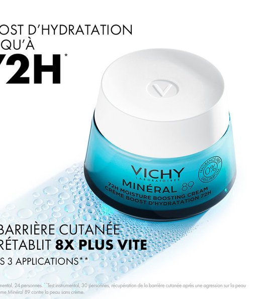 Lorsqu’elle est exposée aux agressions extérieures quotidienne, la barrière d’hydratation de votre peau est affaiblie. Par conséquent, la peau perd ses éléments vitaux : l’eau, les minéraux, les lipides, les vitamines et l’acide hyaluronique. Chez Vichy, nous avons réfléchi à la solution : LA CRÈME HYDRATANTE 72 H Minéral 89 SANS PARFUM. Pour la première fois, les Laboratoires Vichy ont concentré tous ces éléments vitaux pour la peau, dans une crème fraîche et fondante. Elle renforce la barrière d’hydratation de la peau, grâce à des actifs qui pénètrent sur trois couches, jusqu’à l’épiderme, pour une efficacité de trois jours d’hydratation.