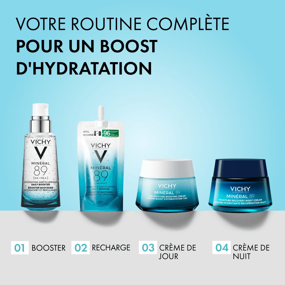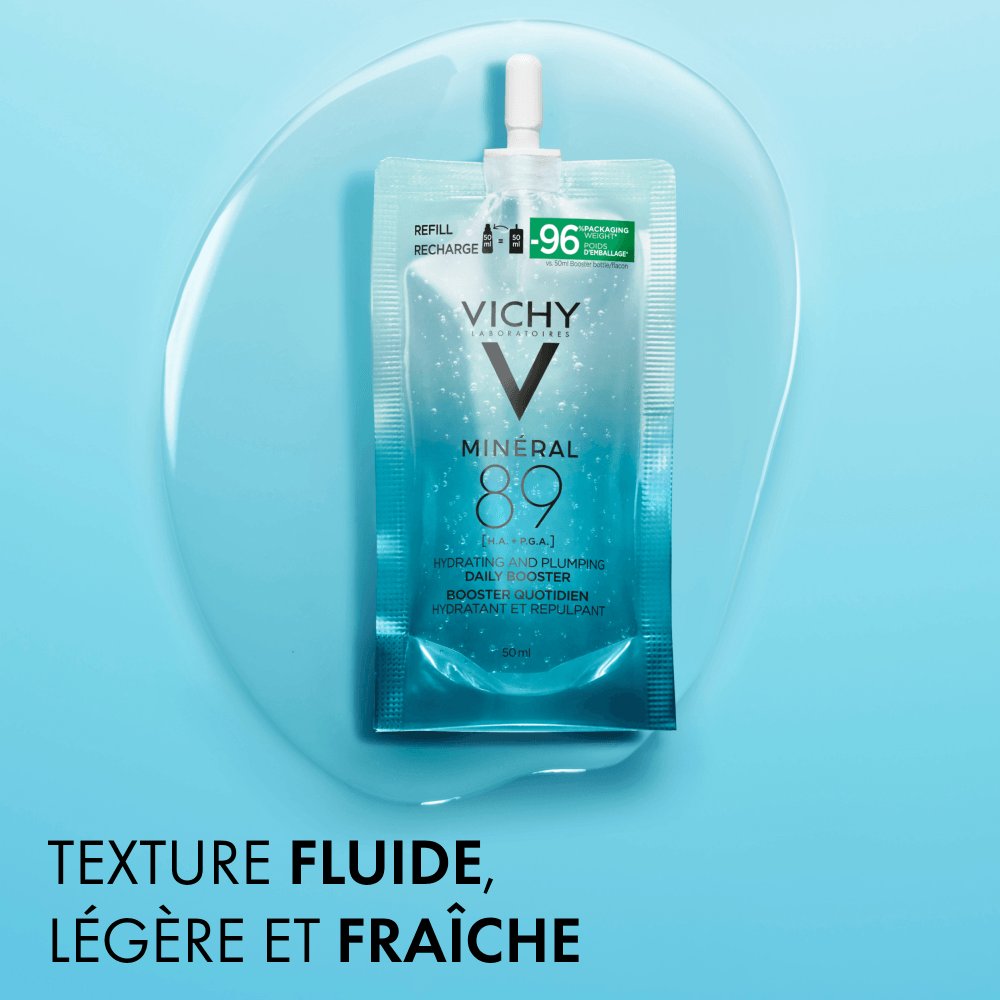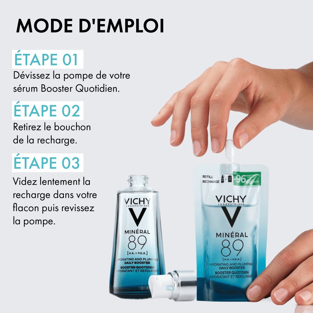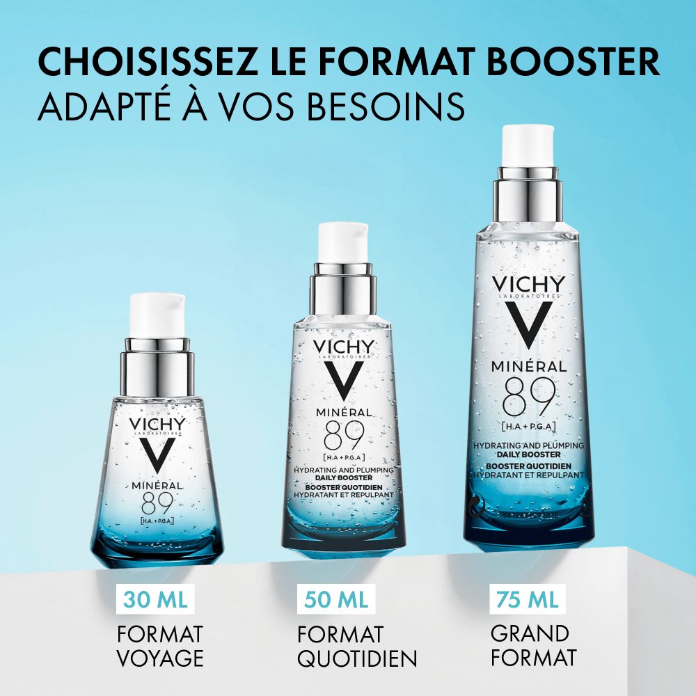 Luttez contre les agressions quotidiennes et la déshydratation avec le nouveau Sérum Booster Quotidien Minéral 89 de Vichy, adapté aux hommes et aux femmes. Notre formule iconique, contenant 89 % d’Eau Volcanique de Vichy, est désormais enrichie en deux acides hydratants: