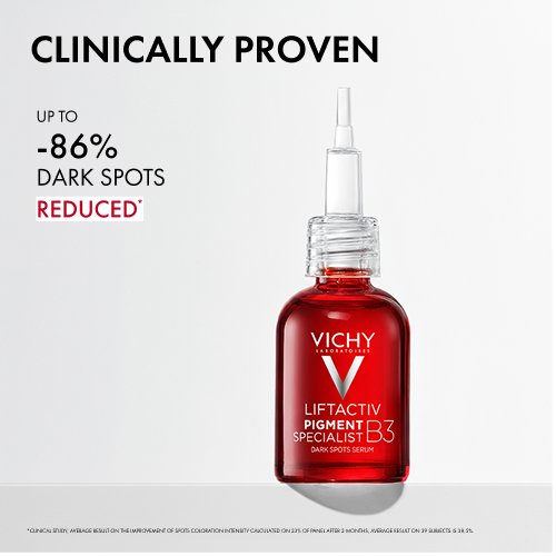 * Étude clinique, résultat moyen sur l’amélioration de l’intensité de la coloration des taches, calculé sur 33 % d’un panel après 3 mois. Le résultat moyen sur 39 sujets est de 38,5 %.