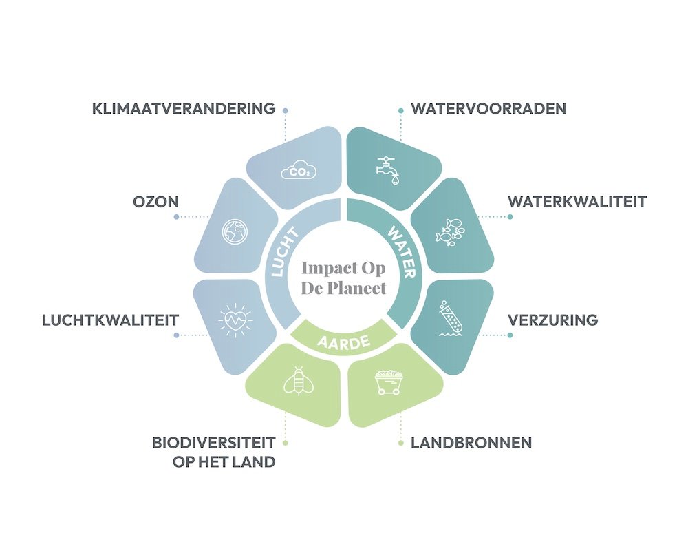 De verschillende soorten impact op de planeet – zoals klimaat, water en biodiversiteit – worden in elke fase van de levenscyclus van het product berekend en vervolgens samengevoegd. Dit is de aanpak die wetenschappers het meest gebruiken om de milieu-impact van een product te meten.